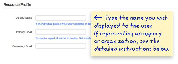 The next section, the Resource Profile, is where you’ll provide information on the individual, organization, business, or agency you represent and that you want displayed to the public.